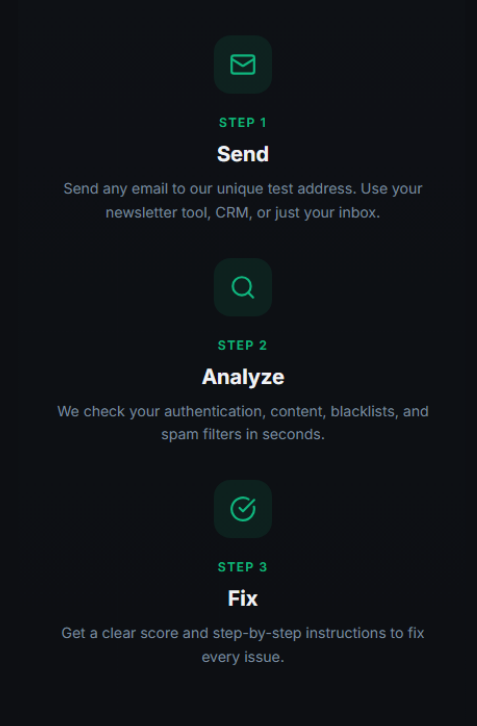 InboxScore je alat koji u 30 sekundi provjerava isporučivost vaše e-pošte i otkriva zašto vaši mailovi završavaju u neželjenoj pošti (Spam). Sustav detaljno analizira tehničku ispravnost (SPF/DKIM/DMARC), provjerava crne liste i ocjenjuje sadržaj poruke putem SpamAssassin filtera. Nakon besplatnog testa dobivate konkretan akcijski plan s uputama kako ukloniti pogreške i osigurati da vaša pošta stiže izravno u primarni pretinac.